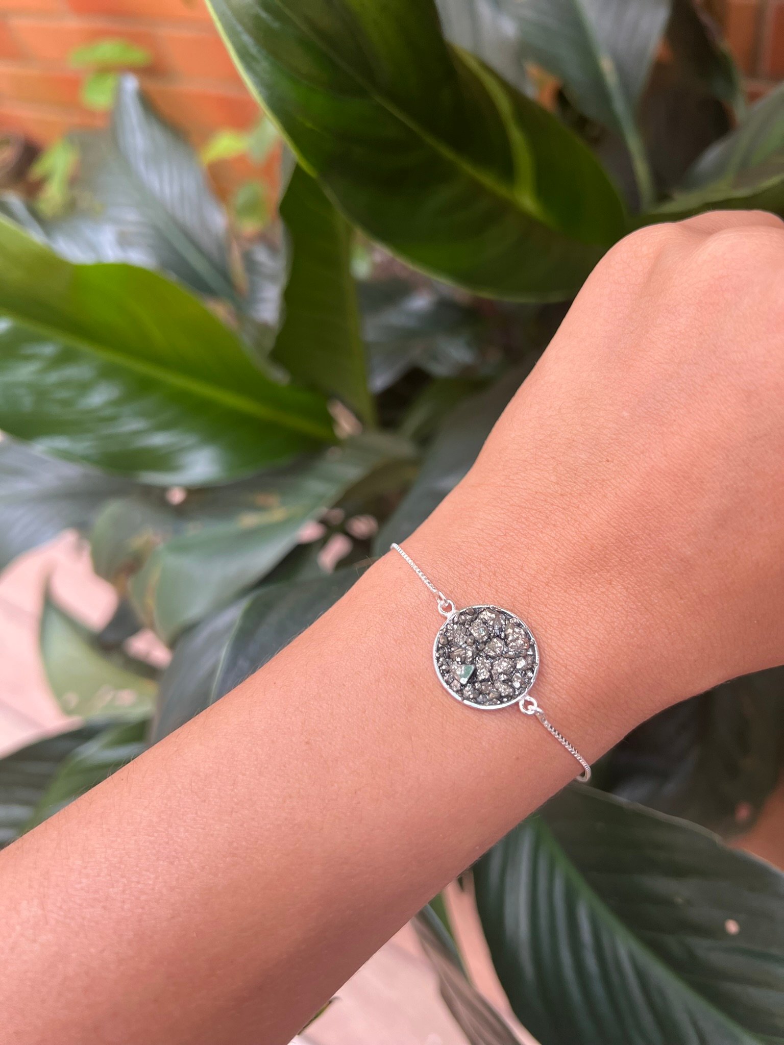 Pulseira fabricada em prata 925. Aplicação de varias micro piritas em uma chapa de prata redonda.